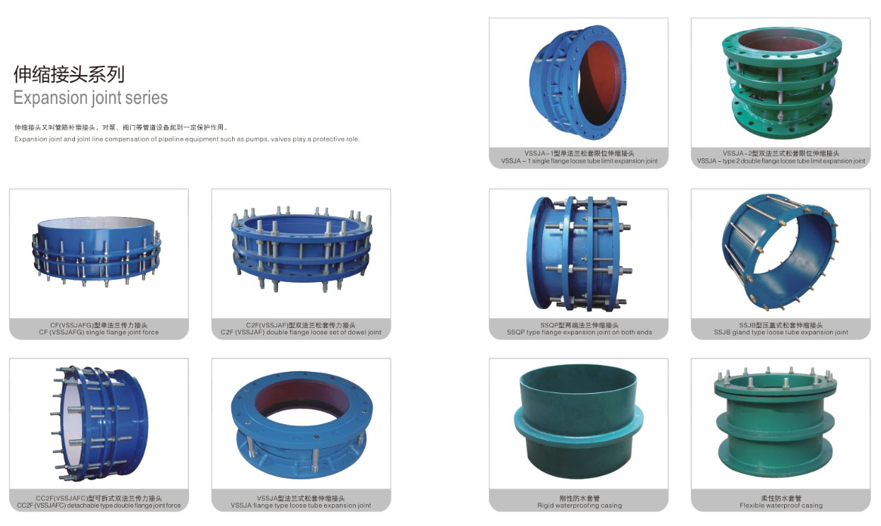 AY型压盖式伸缩接头,AF型法兰式松套伸缩接头,BF型单法兰限位伸缩接头,B2F型双法兰限位伸缩接头,BY型压盖松套限位伸缩接头,CF单法兰传力接头,C2F双法兰传力接头等。